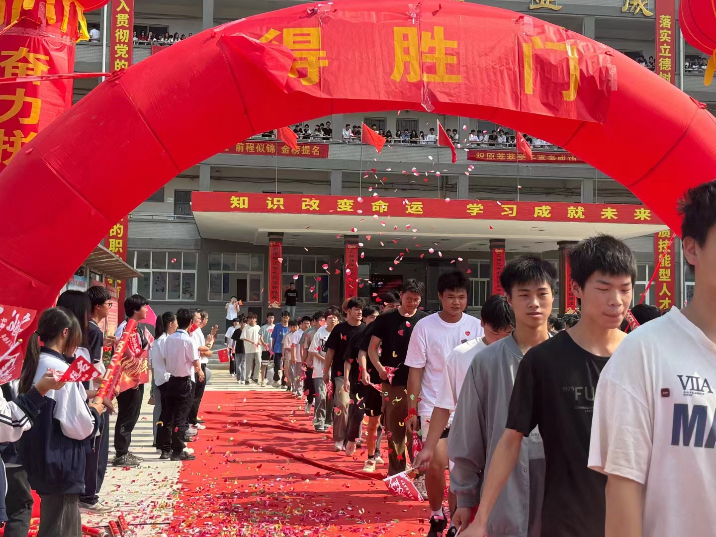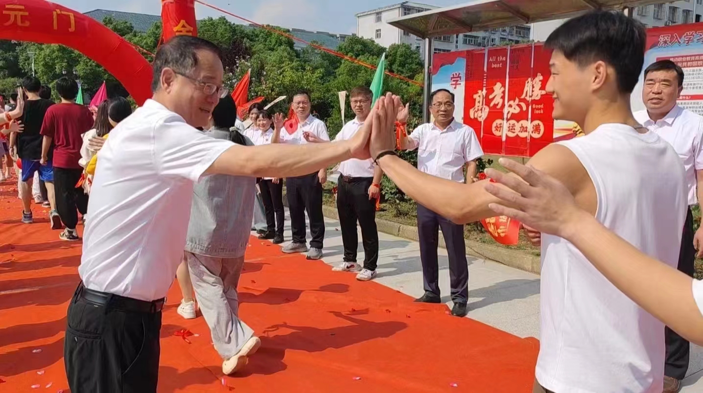 随后高三学子们走上红毯,穿过状元门,校领导与老师们夹道送考、与高三学子击掌加油,时不时地拍拍考生的肩膀,鼓励考生,相信自己,努力前行!